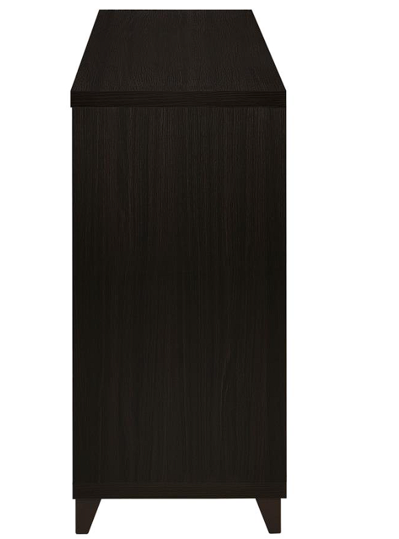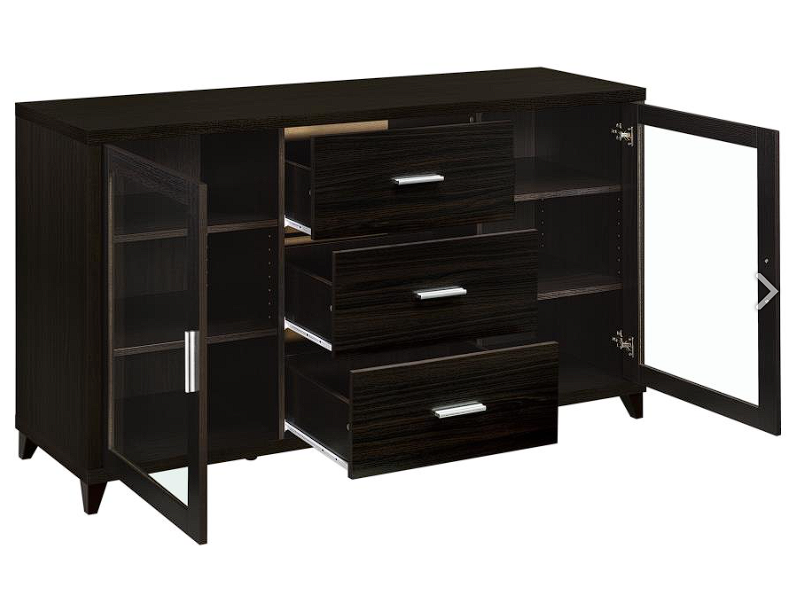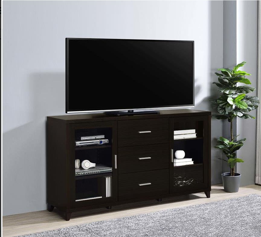 - TV console features two clear tempered glass framed doors with four (4) height adjustable shelves & three (3) storage drawers