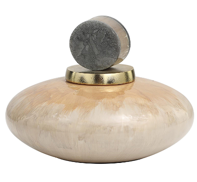 Elegant modern jar features a satin gold lid and polished shades of peach and ivory in a dipped ombre design, with a gray marble accent piece at the top