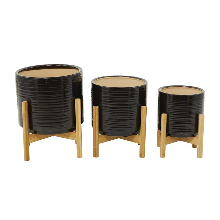 Our stylish black planters with stands showcase 3 deep cylinder stoneware pots designed with horizontal ribbings and short X-shaped bamboo leg stands