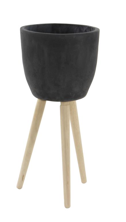 Drum-shaped matte black planter with deep interior for large plants with wooden tripod base