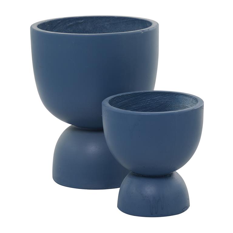 - Blue planters feature wide-rounded pot bodies with a goblet-inspired structure