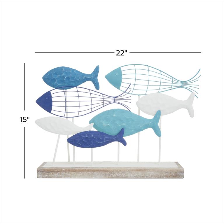 - This refreshing blue fish sculpture features a school of fish set figure attached on a thick rectangular wooden base