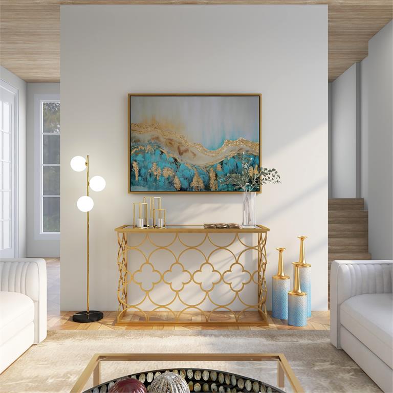Metallic gold finishes throughout the tops with gradient baby blue down throughout the bottoms