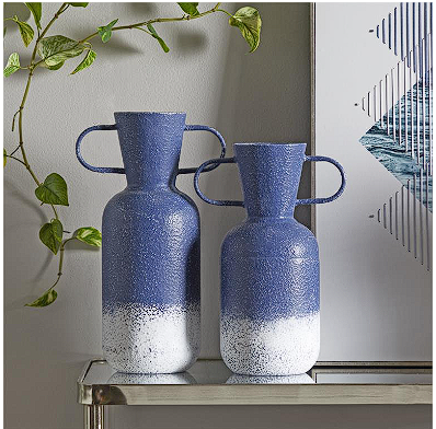 Matte blue finish with white distressing gives these modern vases a chic modern appeal