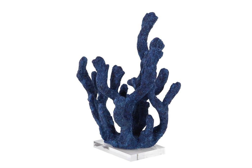 Reef sculpture features a reef coral in a bright blue finish mounted on a nice square base