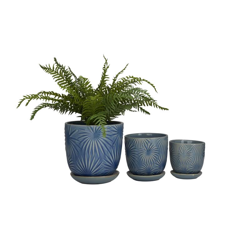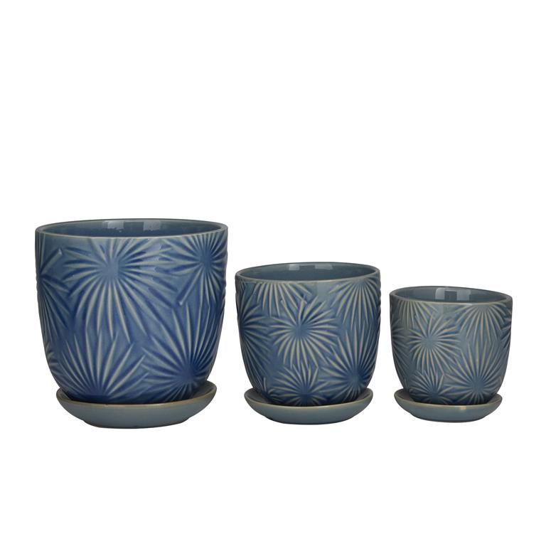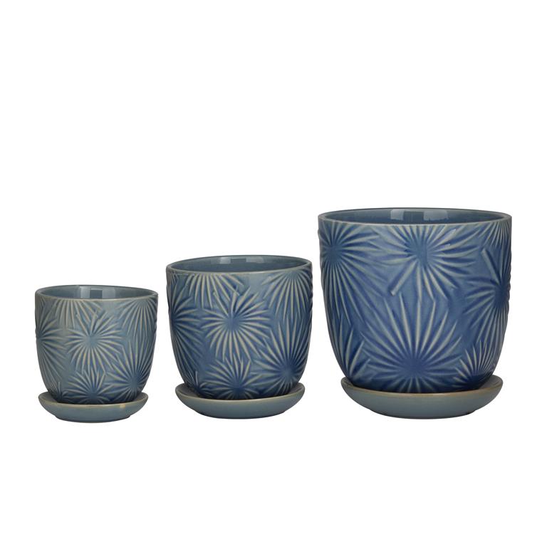 Transitional blue porcelain planters showcase round potted bodies designed with a palm leaf patterned embossment and a plain base saucer of the same color tone