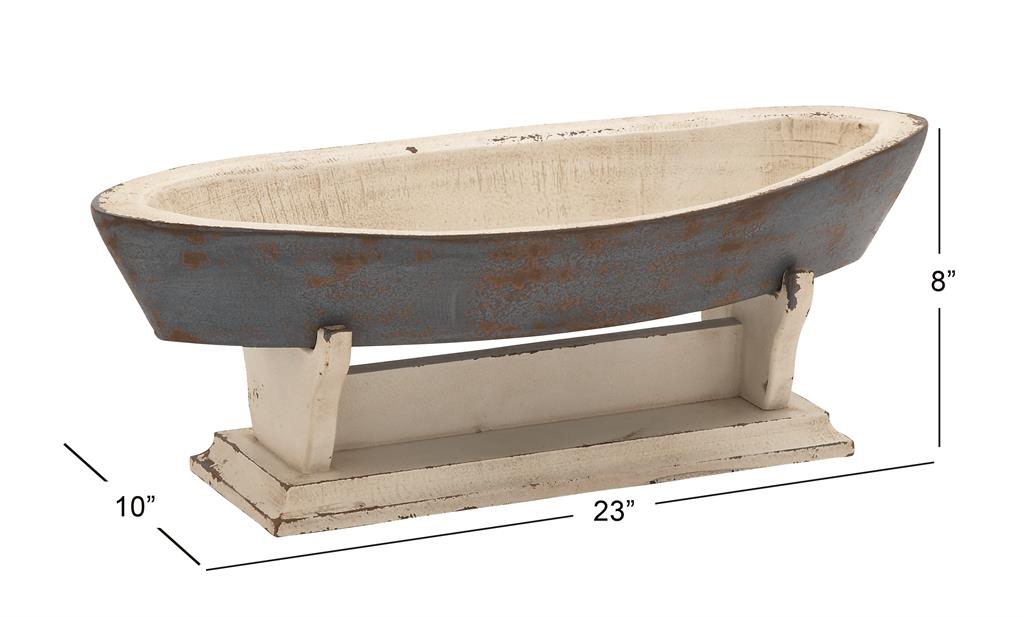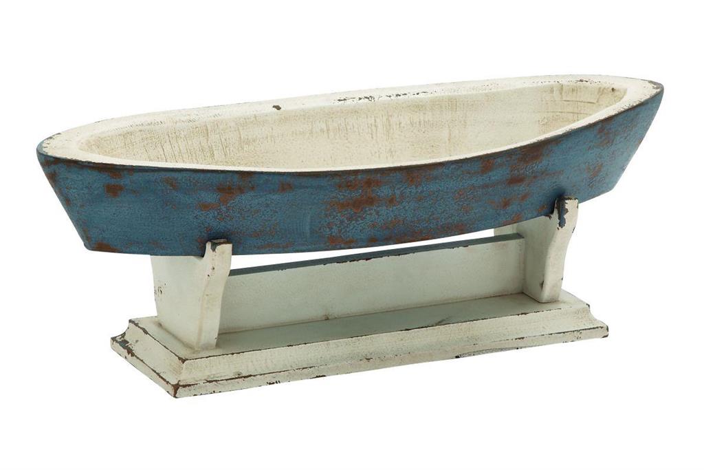 The sculpture features a regular canoe-shaped boat on a pedestal rack with distressed accents on the color