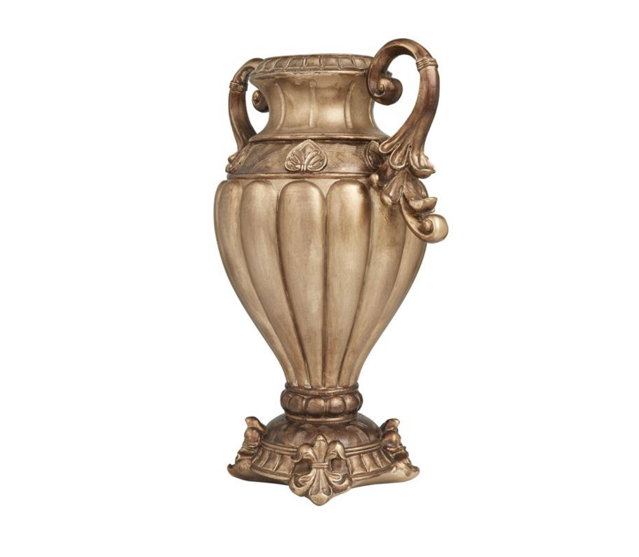 - This old world inspired urn jar features a Greek trophy design with scrolled ear handles, leaf embossments, and Fleur de Lis carvings at the bottom