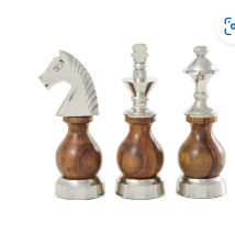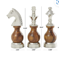 Large 3 piece chess statues have a shiny metallic silver finish on their heads and base with brown wood bodies
