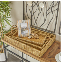 Set of 3 nesting trays are made from bamboo and dried natural plant, on an mdf base