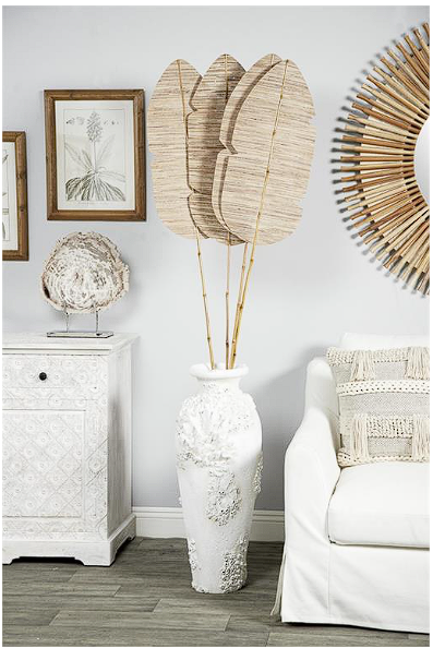 These tall decorative fans have 3” textured, wheat-beige palm leaves and light golden-brown bamboo sticks, the leaves are molded into hard-dried, wavy designs with ridged edges for a natural foliage silhouette