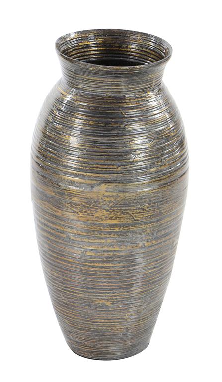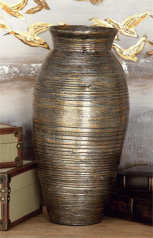 Brown flower vase has a warm, shiny finish with distressed horizontal lines that generates a vintage appeal