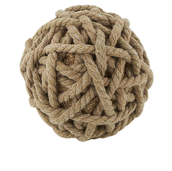 - Rope orb décor highlights a round shape with woven cotton pieces wrapped around the exterior