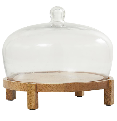 - A dome shaped glass cloche with solid pattern and round finial top, and four wood legs under the base