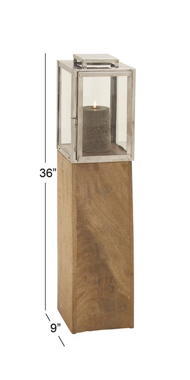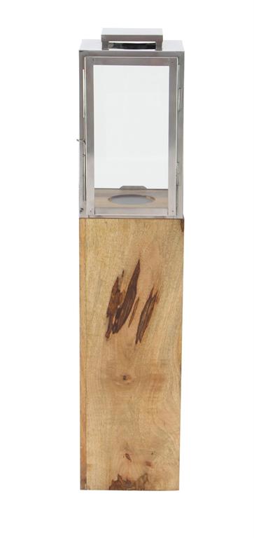 This floor candle lantern candle holder is harmonious medley of mango wood, clear glass, and stainless steel