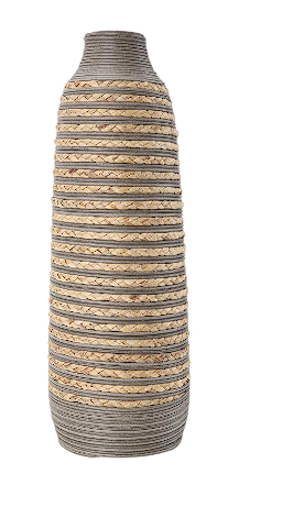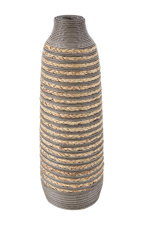 BROWN SEAGRASS HANDMADE BRAIDED VASE WITH LAYERED GRAY PANELING, 9" X 9" X 24"