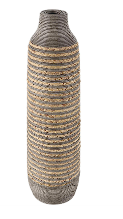 BROWN SEAGRASS HANDMADE BRAIDED VASE WITH LAYERED GRAY PANELING, 9" X 9" X 32"
