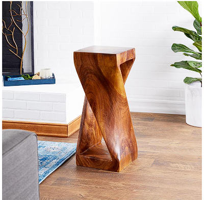 - The wood material of this unique accent table is carved and shaped to form a twisted design