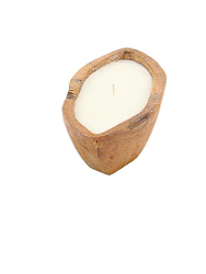 Features a brown boat-shaped candle holder that is handmade, and comes with a white wax candle inside