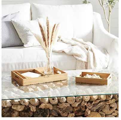 - This tray set features rectangular wooden slat patterns and rectangular designed trays