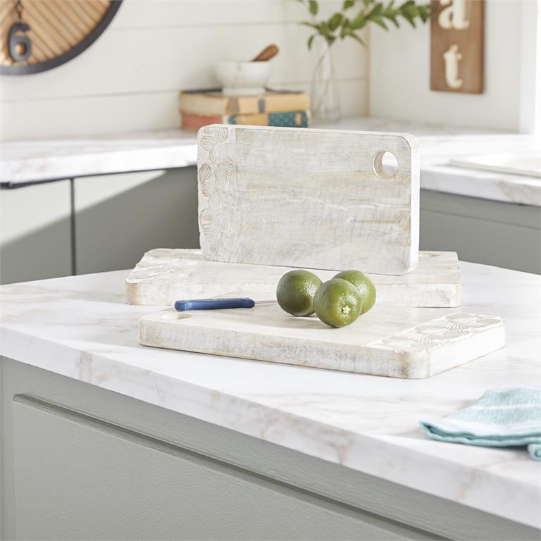 - Each mango wood board is cut, carved and topped off with a whitewash finish