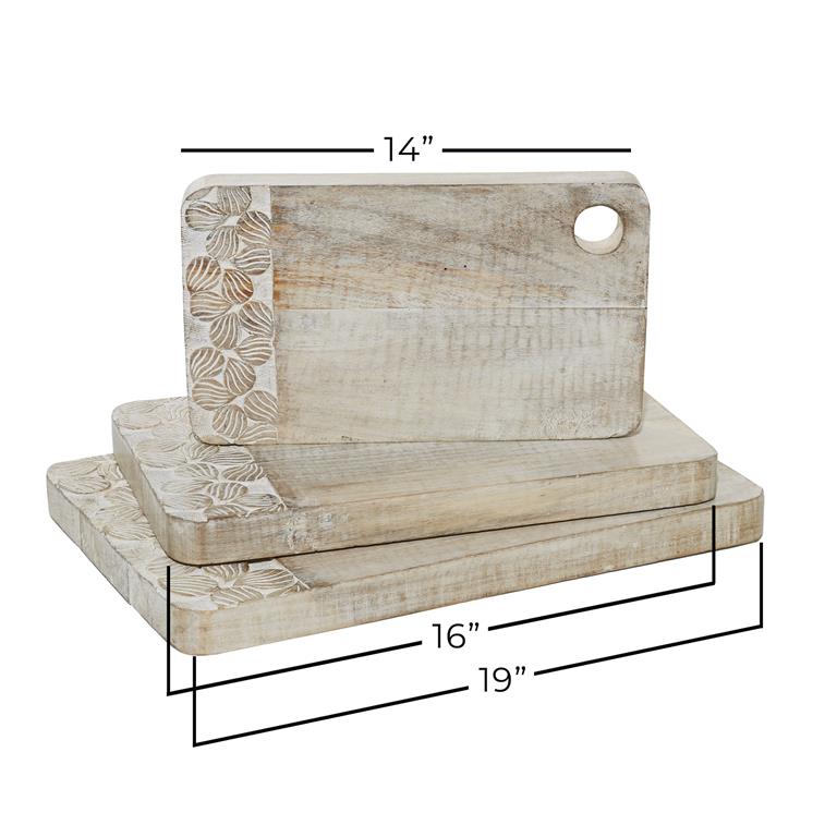 Whitewashed natural wood brown finish highlights this cutting board set