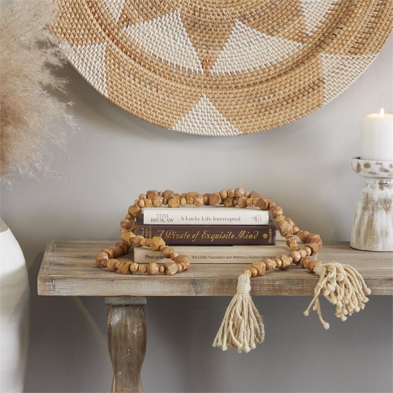 - Bohemian garland with tassels accentuating various geometric bead accents with wood grain pattern