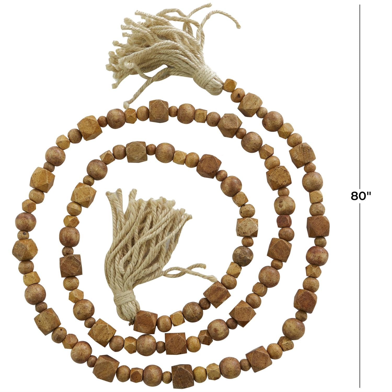 A garland for home featuring natural brown geometric bead details with cream cotton tassels on both ends
