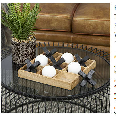 - Wood is intricately carved and painted to form the oversized tic-tac-toe game pieces and square holder