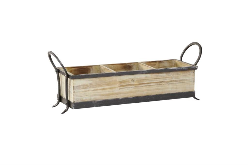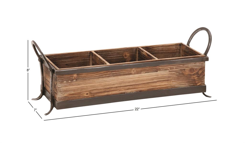 This delightful wooden organizer tray features a long rectangular tray basket with metal-forged handles and legs