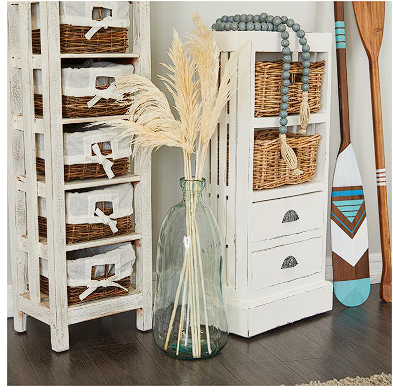 This coastal glass vase features a cylinder bottle shape and a transparent glass exterior
