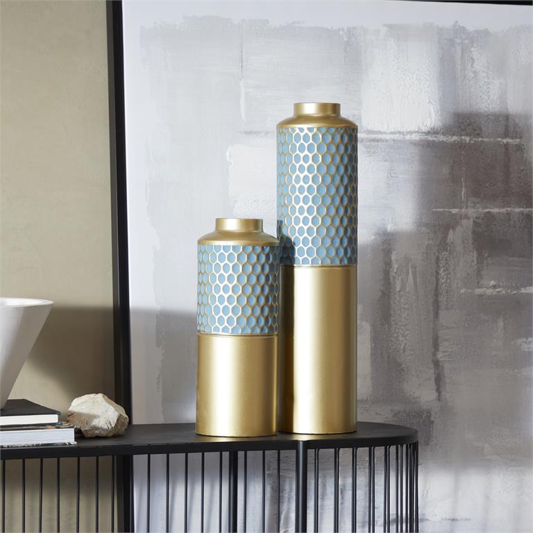 - Tall gold vases accentuate cylinder forms with honeycomb patterns in the upper half