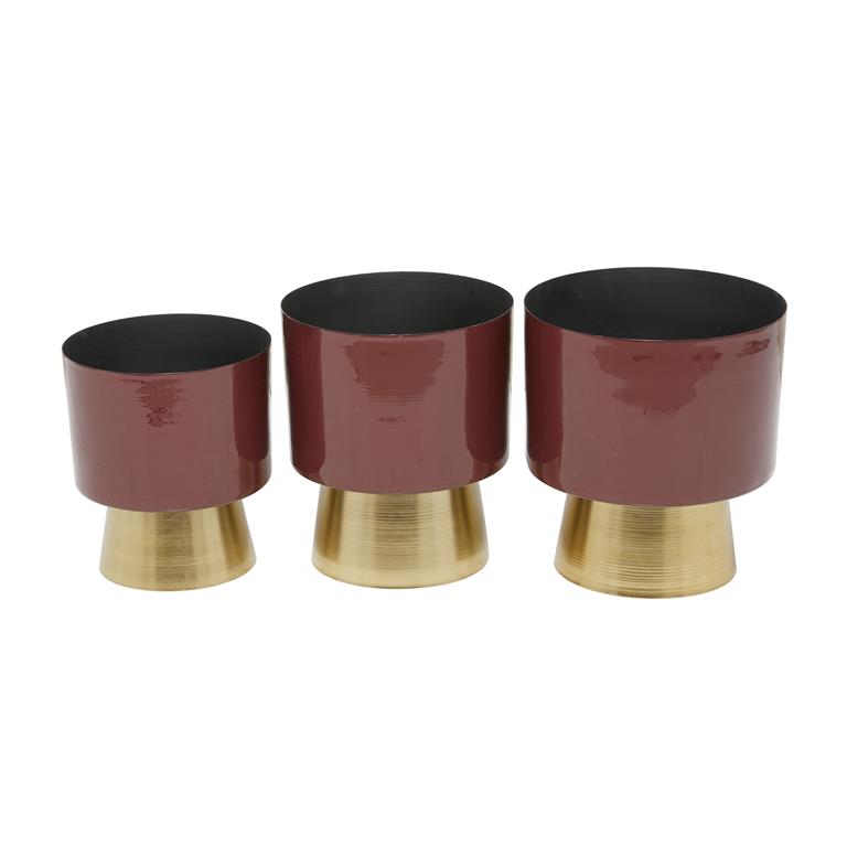 - This set of 3 red metal planters comes with cylindrical pots and round stands with horizontal line details