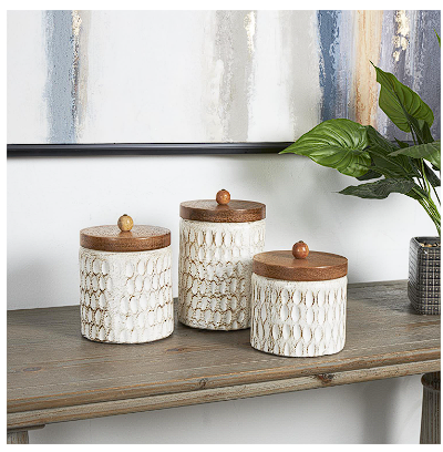 This white ceramic and brown wood stone ware canister set features a cylindrical body with engraved curved patterns for aesthetic and easy-grip purposes
