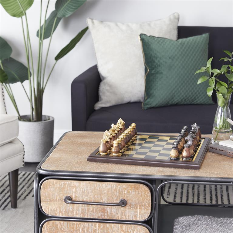 - A marriage of aluminum and mango wood is used to construct the detailed form of this chess board game set