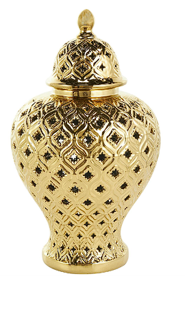 Large urn and lid with a glossy gold finish, finial top, and carved round lattice pattern holes