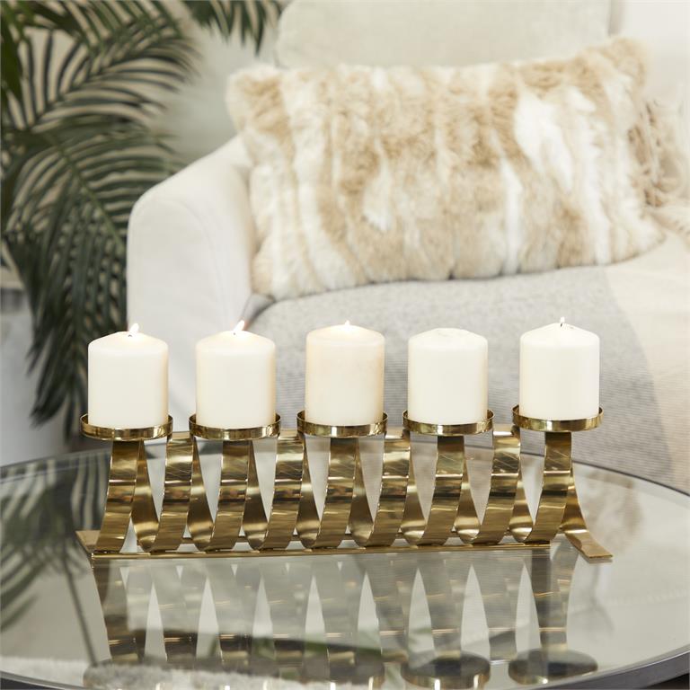 A gold pillar candle holder that gives glamour and personality to your living room when placed on top of accent table, mantel, or counter top