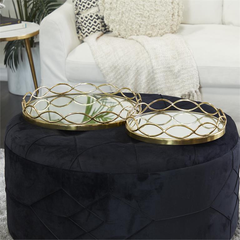 - The round reflective glass panels of this decorative tray set are securely encased in welded gold stainless steel frames