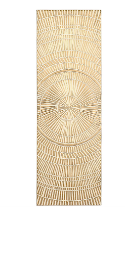 Modern gold colored wood panels has a large carved starburst design extending beyond the sides of the panel