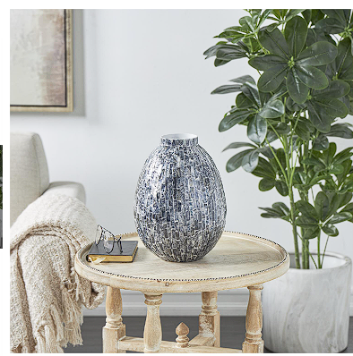 Contemporary mother of pearl vase highlights a stunning combination of glossy gray, cream, and blue hues for an added touch of elegance in the home
