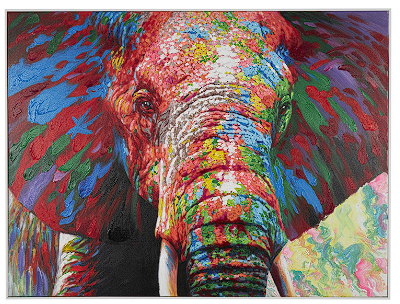 - Colorful wall art has a rectangular shape with an abstract elephant head and paint splatter designs