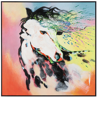 - Colorful wall art has a square shape with an abstract horse head and paint splatter designs