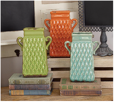 - Each vase is molded with two side handles and a rectangular opening that lengthens towards the base