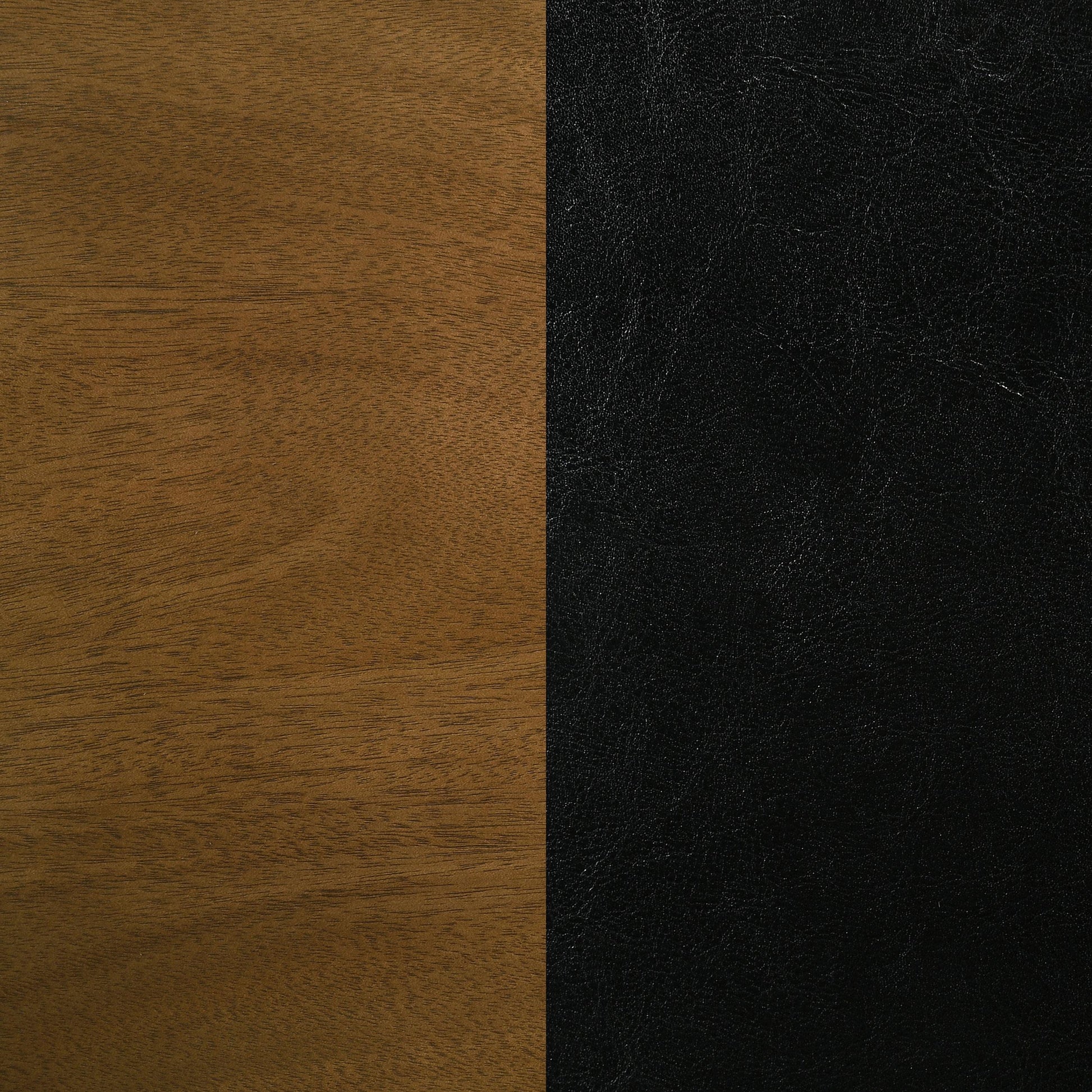 - * Four chairs feature a classic slatted back and black faux leather upholstery