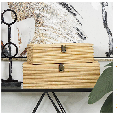 The set features two rectangular boxes with carved horizontal lines and brass clasps