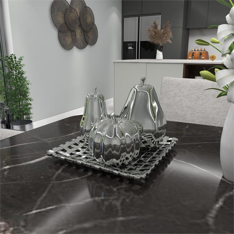 SILVER CERAMIC FRUIT DECORATIVE SCULPTURE WITH PLATE,