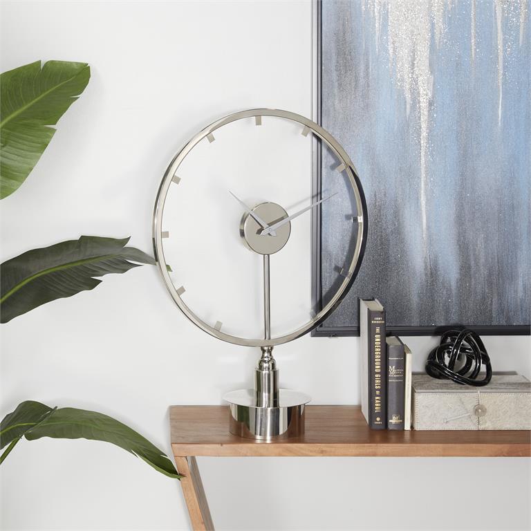 This stainless steel table clock features a round transparent clock face with short markings and long clock hands, thin metal stand, and a round stable base