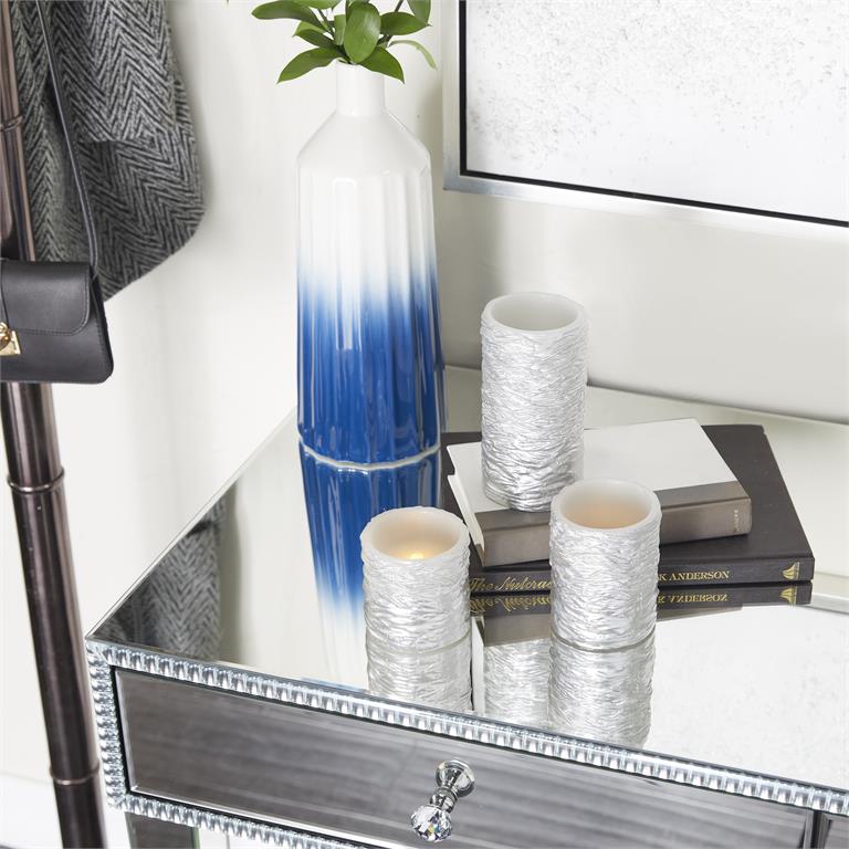 These mesmerizing LED flameless candles features a textured metallic silver wax body finish