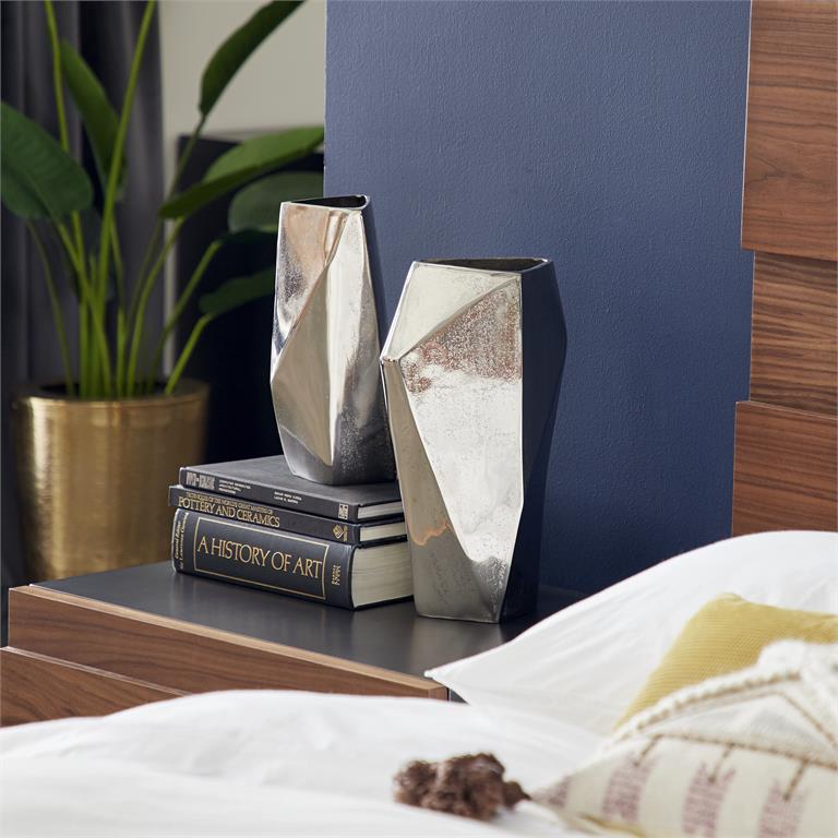 These vases features a metallic silver finish with angular faceted look