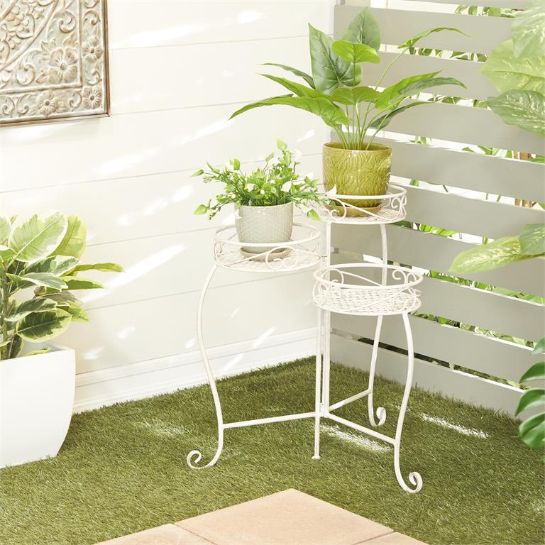 - This plant stand accentuates round shelves with scroll patterns and grid style bottoms along with curved metal legs and stable scrolled feet